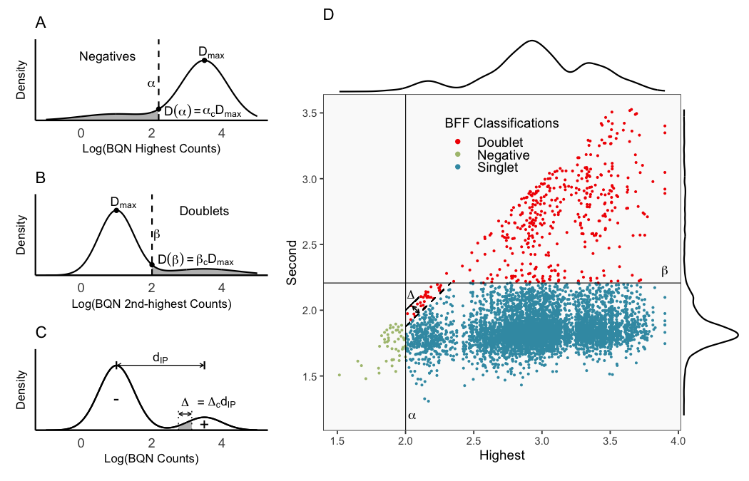 BFF_raw classifies droplets based on comparison of raw count values to the thresholds found by fitting. Droplets are classified as singlets when they are positive for just one barcode, as doublets when positive for multiple barcodes, and as negatives when they are negative for all barcodes.