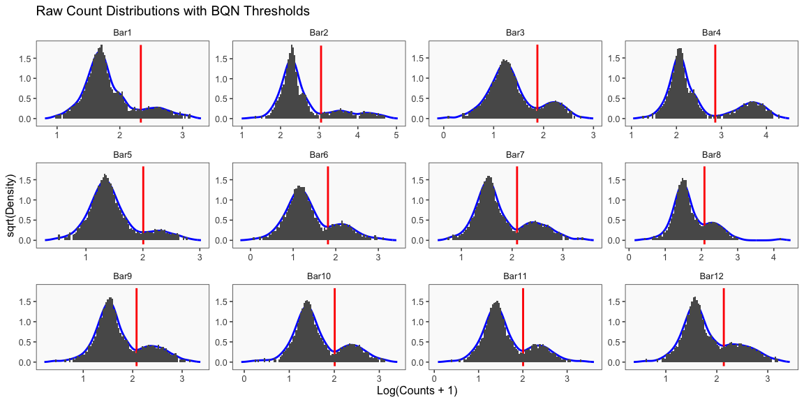 The following code produces QC plots helpful in visualizing the effects of various normalization procedures on cell hashing data, including the novel normalization Bimodal Quantile Normalization (BQN).